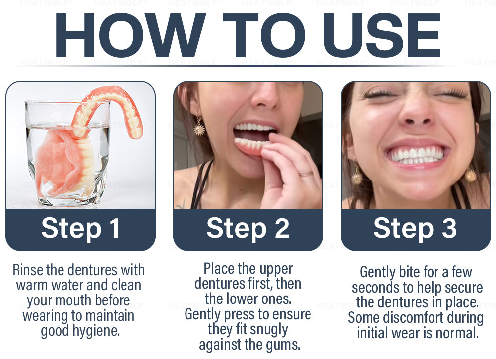 After receiving your ROSOPL™ dentures, gently remove them from the packaging. Inspect the dentures for any visible issues and ensure they are clean before first use. - Soften the Dentures for a Better Fit: